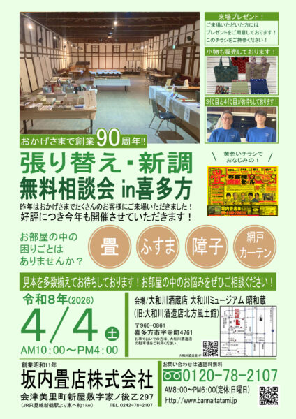 【告知】会津喜多方酒蔵ホルン合奏会 2026.03.22 以下の通り、4月12日(日)のイベントをお知らせします。 …続きを読む 大和川イベント【告知】 【告知】畳の張り替え・新調無料相談会 2026.03.19 以下の通り、4月4日(土)のイベントをお知らせします。 …続きを読む 大和川イベント【告知】 催事のお知らせ 2026.03.13 【3月】 【4月・5月】◎ふくしまデスティネーションキャンペーン◎ 首都圏のJR主要駅で物産展が開催され弥右衛門がお買い求めいただけます。○4月1日〜4月5日 10:00-20:00(最終日は17時まで)場所:東京都 JR上野駅 中央改札外グランドコンコース ○4月9日〜4月13日 詳細未定場所:東京都 JR東京駅 ○4月15日〜4月19日 詳細未定場所:宮城県 JR仙台駅 西口ステンドグラス前 ○4月22日〜4月26日 詳細未定場所:埼玉県 JR大宮駅 西口イベントスペース ○5月27日〜31日 詳細未定場所:埼玉県 JR浦和駅 詳細未定 皆様のご来訪を、心よりお待ちしております。 催事のお知らせ 【告知】チャリティーコンサート 2026.03.12 以下の通り、3月29日(日)のイベントをお知らせします。 …続きを読む 大和川イベント【告知】 追悼3.11。変わらない絆。 2026.03.11 2011年3月11日、午後2時46分。あれから15年が経ちました。 …続きを読む 大和川震災支援活動 春季限定商品・春頒布会の販売開始のお知らせ 2026.03.03 いつも弥右衛門酒をご愛飲いただきまして、誠にありがとうございます。オンラインショップでは、春季限定商品「あらばしり」「日晴鳥の心」「雪蔵囲い」「源泉仕込」が登場し、各月お届けの「春の蔵出し限定頒布会」も予約販売を開始いたしました。今年は震災から15年。福島の絆から生まれた「桃の涙」「夜ぐると」も是非合わせてご賞味いただきたいリキュールです。ご用命を心よりお待ちしております。 News 3月のカフェ天空回廊の営業日について 2026.03.01 館内のカフェ天空回廊の3月の営業日についてお知らせいたします。 通常の営業日:金・土・日・月営業時間:11:00〜16:00休業日:火・水・木 ご来店を、心よりお待ちしております。 News 酒粕で元気に!美容にもオススメです。 2026.02.16 徐々に気温が上がってきた2月ですが、インフルエンザもまだまだ猛威を振るっています。体調管理も大事ですが、健康は勿論美容にも良いとされている「酒粕」を是非、この機会にいかがでしょうか? …続きを読む 大和川の日常 【終了】今年も開催!ひなと天神様の蔵めぐりスタートしました。 2026.02.12 2月11日から3月3日まで、喜多方市内各所で「ひなと天神様の蔵めぐり」を開催しています♪ …続きを読む 大和川イベント【報告】大和川の日常 節分・恵方呑みをお楽しみください♪ 2026.02.03 本日2月3日は節分です。豆まき・恵方呑みの準備はお済みでしょうか? …続きを読む 大和川の日常 12345...102030...> »